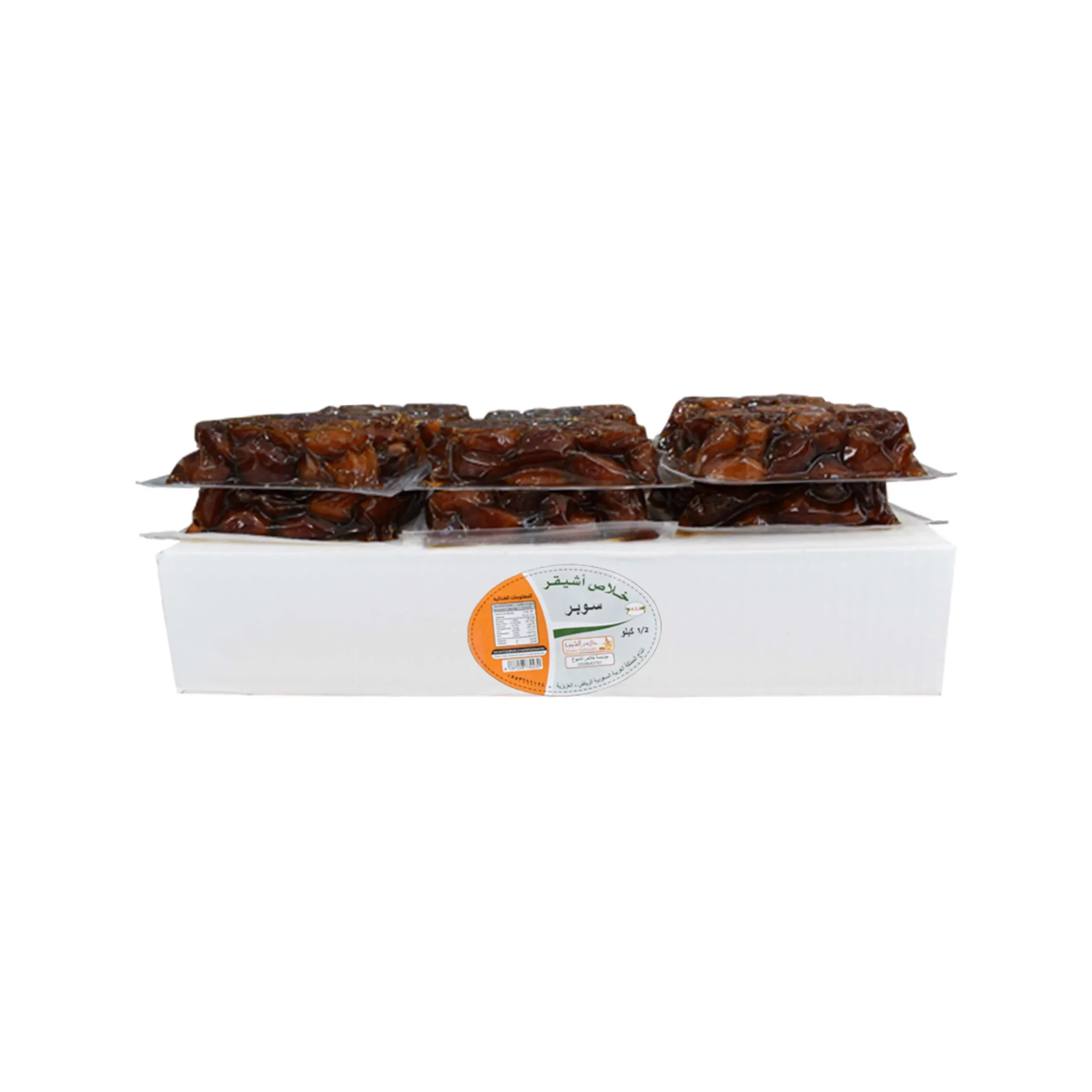 - التعبئة والوزن: يأتي المنتج في عبوات مخصصة، حيث يحتوي الكرتون الواحد على 8 حبات (أكياس أو علب) منفصلة، وزن كل حبة منها 500 جرام، ليصبح الوزن الإجمالي الصافي حوالي 4 كيلوجرام. هذا النوع من التعبئة مثالي لـالضيافة الفاخرة وللحفاظ على التمر طازجاً ومنع تعرض الكمية كلها للهواء دفعة واحدة.
